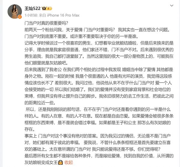 12月5日,杜淳妻子王灿发长文谈自己对爱情门当户对的看法,她表示:“或许重不重要取决于你的另一半是谁。有的人在意、有的人不在意,现在都是自由恋爱。如果爱情会被很多条条框框的东西束缚,是不是就会错过幸福。 要我说,不管什么条条框框还是首先要建立在喜欢的基础上。”她还表示老公杜淳曾说过:“我从来不在乎什么门当户对,爱一个人,会接受她的一切。”