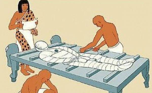 古埃及人首先用长长的、特制的细铁钩深入死者的鼻孔中,穿过眼睛后面的筛骨,进入头颅,从中一点儿一点儿掏出部分脑浆,然后把已经配好的药材汤剂灌进已经被掏空的脑壳中,用来清涮大脑及其他铁钩碰不到的部分。