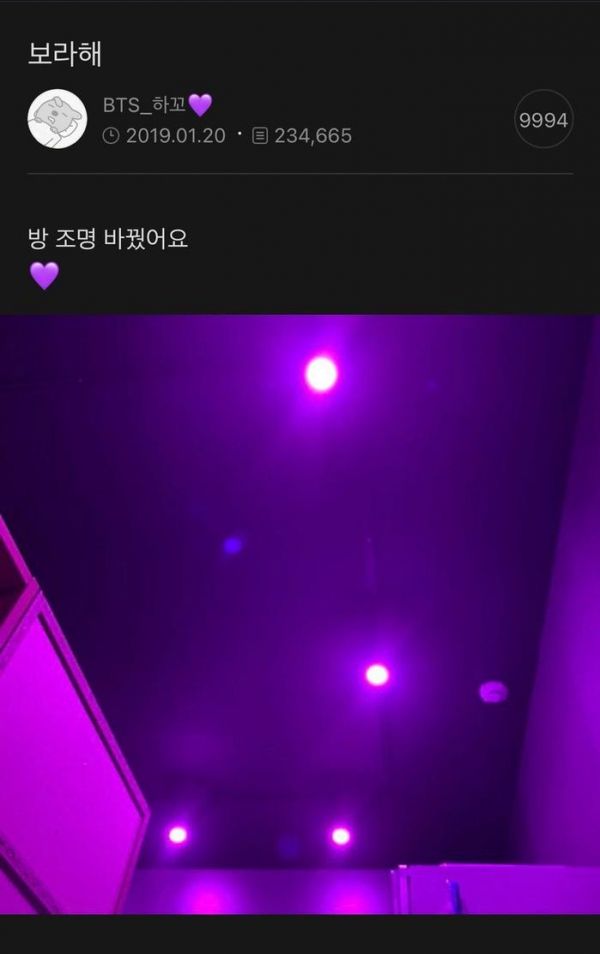 照明也是紫色的? 是我特意换的照明颜色... 好看吗? (241218)夏灰 - 换房间照明了(190120)柾国真的是始终如一...把灯光换成紫色后 来告诉粉丝们 太乖了ᵒ̴̶̷̥ ́·̫ ᵒ̴̶̷̣̥ ̀ /golden__901#田柾国[超话]#