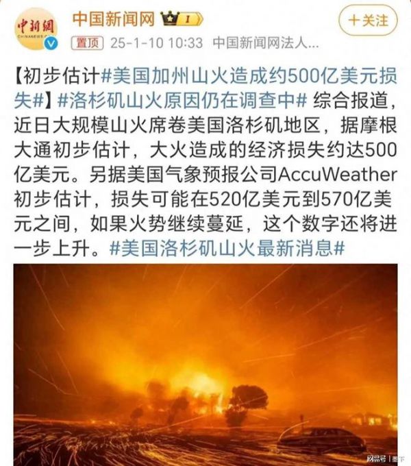 近期,美国洛杉矶发生了一场大火,这场灾难造成了巨大的损失,不仅有11人不幸丧生,还有一千多套豪宅被烧毁,经济损失高达500多亿美元。目前,大火仍在继续蔓延,主城区也面临着被波及的风险。