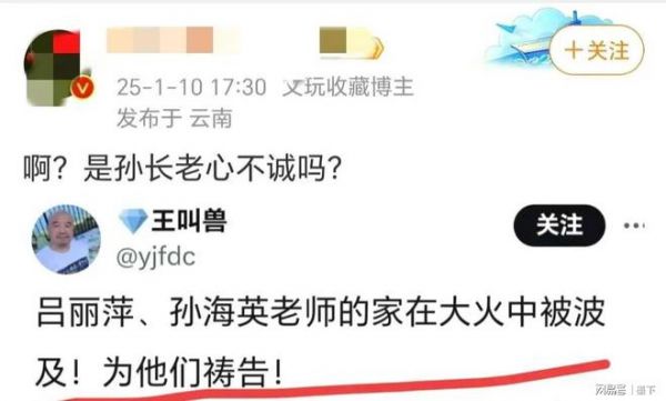有博主爆料称,孙海英和吕丽萍在洛杉矶的豪宅可能在这场大火中被烧毁。孙海英和吕丽萍几年前选择移民美国,并在洛杉矶购买了一栋豪宅。他们经常在豪宅中举办聚会,邀请亲朋好友前来共享欢乐时光。这栋豪宅装修精美,拥有十几个房间,但平时只有他们夫妇二人居住。如今,这栋豪宅可能在这场大火中化为灰烬,但目前尚不清楚具体情况,孙海英也未对此作出回应。