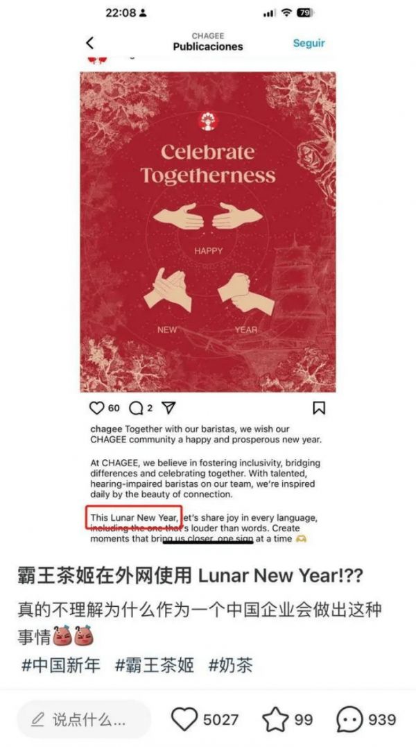 在外网,霸王茶姬发文时使用的表述是Lunar new Year,而不是Chinese New Year,被部分网友质疑。