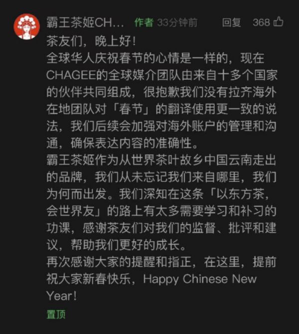 1月24日晚,霸王茶姬CHAGEE还就“春节”一词翻译不当致歉:“很抱歉我们没有拉齐海外在地团队对‘春节’的翻译使用更一致的说法,我们后续会加强对海外账户的管理和沟通,确保表达内容的准确性。”