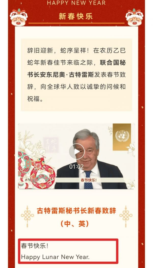 事实上,在英语世界,大家对于“中国新年”的翻译并不统一。《新民周刊》发现,犯了霸王茶姬同样翻译问题的还有今天(1月25日)给大家送新春祝福的联合国秘书长古特雷斯。