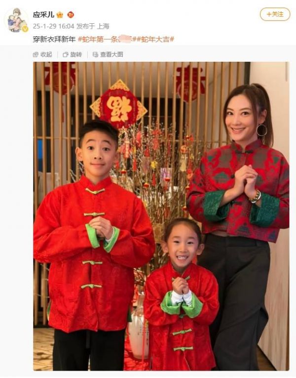搜狐娱乐讯 1月29日,应采儿在个人社交账号晒出了一张大年初一拜年照,照片中她和俩儿子身穿中式红色马甲,面带笑容喜庆洋洋,母子三人都双手抱拳,恭贺网友。