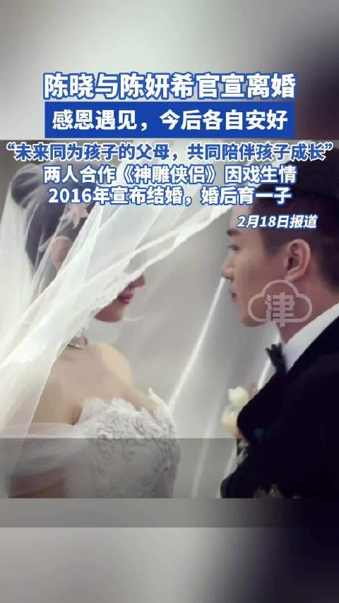 【#陈晓陈妍希离婚# “感恩遇见,今后各自安好”】#一文回顾陈晓陈妍希感情时间线# 2月18日,演员陈晓、陈妍希通过微博官宣离婚他们发出共同的文字表示:“感恩遇见,今后各自安好,未来同为孩子的父母,共同陪伴孩子成长。”据悉,2014年,陈妍希和陈晓因合作《神雕侠侣》因戏生情,2016年宣布结婚,婚后育一子。此前,陈妍希父亲去世,陈晓未参加丧礼也未发文悼念引发婚变猜测。#陈晓陈妍希 今后各自安好#特别声明:以上文章内容仅代表作者本人观点,不代表新浪网观点或立场。如有关于作品内容、版权或其它问题请于作品发表后的30日内与新浪网联系。相关知识