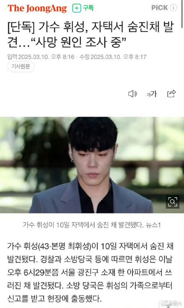 韩国歌手辉星被发现死于家中,年仅43岁,死因正在调查中