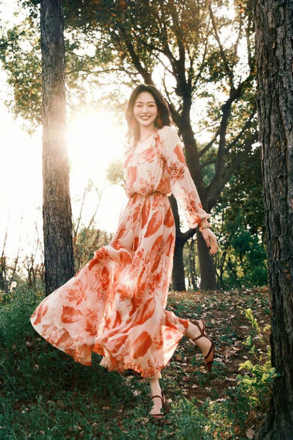 唐嫣穿碎花长裙漫步公园,雪肤乌发勾勒春日浪漫画卷