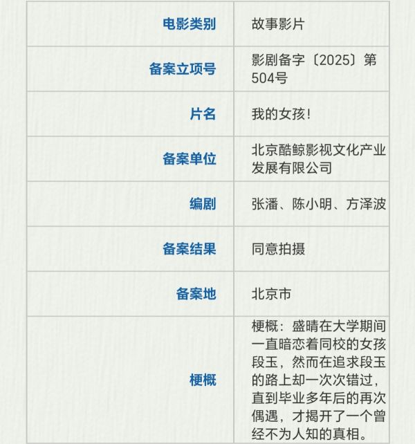 北京酷鲸影视文化产业发展有限公司备案了《我的女孩!》《见春天》。