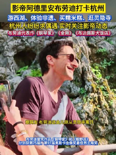 #阿德里安·布劳迪[超话]# 【求偶遇!#奥斯卡影帝阿德里安布劳迪打卡杭州#】4月14日,浙江杭州。不少网友在杭州街头偶遇了阿德里安·布劳迪,游西湖、逛灵隐、体验非遗、买糯米糕、还在运河边给杭州喝茶大爷当起了背景。此前,阿德里安·布劳迪开通了中国社交平台账号,并发视频称,自己计划到中国旅行。2003年,他凭借电影《钢琴家》获得第75届奥斯卡金像奖最佳男主角奖。特别声明:以上文章内容仅代表作者本人观点,不代表新浪网观点或立场。如有关于作品内容、版权或其它问题请于作品发表后的30日内与新浪网联系。相关知识