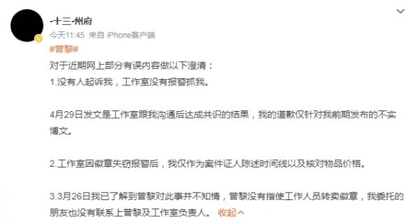 曾黎工作室再道歉