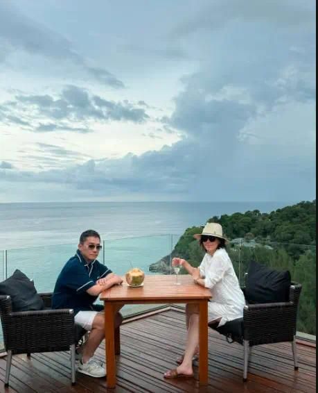 刘嘉玲近期与多位亲人开启度假之旅,她先是在社交平台分享了和梁朝伟的合照。照片中的刘嘉玲,身着米色休闲短裙,头戴草帽,亲昵地搭着老公的肩头,夫妻二人面带微笑,尽显恩爱甜蜜。