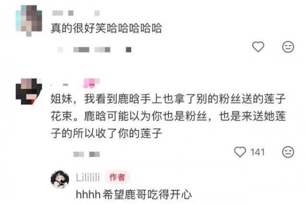 随后,该路人小姐姐发视频解释:整件事就是很巧和好玩,莲子被拿我是惊讶加开心的。我是初中开始喜欢他的路人粉,但当时真没打算给他,毕竟艺人收食物有安全顾虑。并喊话鹿晗,请好好享用20/斤的莲子!