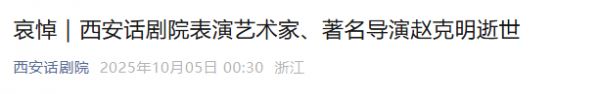 据西安话剧院官方消息,著名表演艺术家、导演、一级演员赵克明因病于2025年10月4日15时55分逝世,享年93岁。