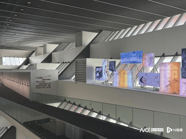 对此,王绍强介绍道,“有些地方我们从审美、展览策划以及观众观感的感受中整体去想,其实非常难解决,所以我们设计了一个观看体验非常好的沉浸式展厅,也尽量选择了一些动态表现效果好的作品放在这里展示。”另外,展馆内还通过长300米的文献时光长廊,展示广东美术发展百年来的重要历史事件,在此之中还进行了包括AI生成作品这类具有当代性的设计,现场科技元素“拉满”。