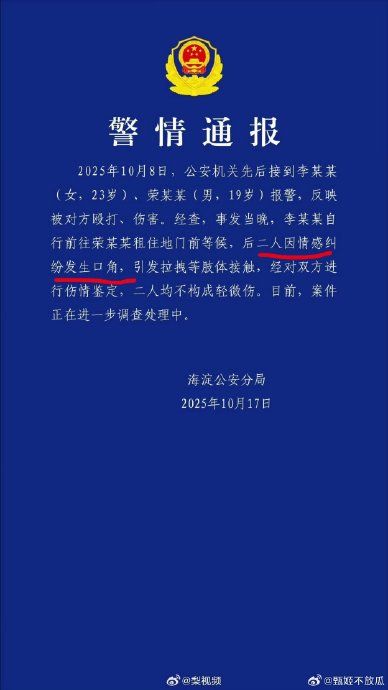 警方通报荣梓杉李禹熹纠纷:因情感纠纷发生口角