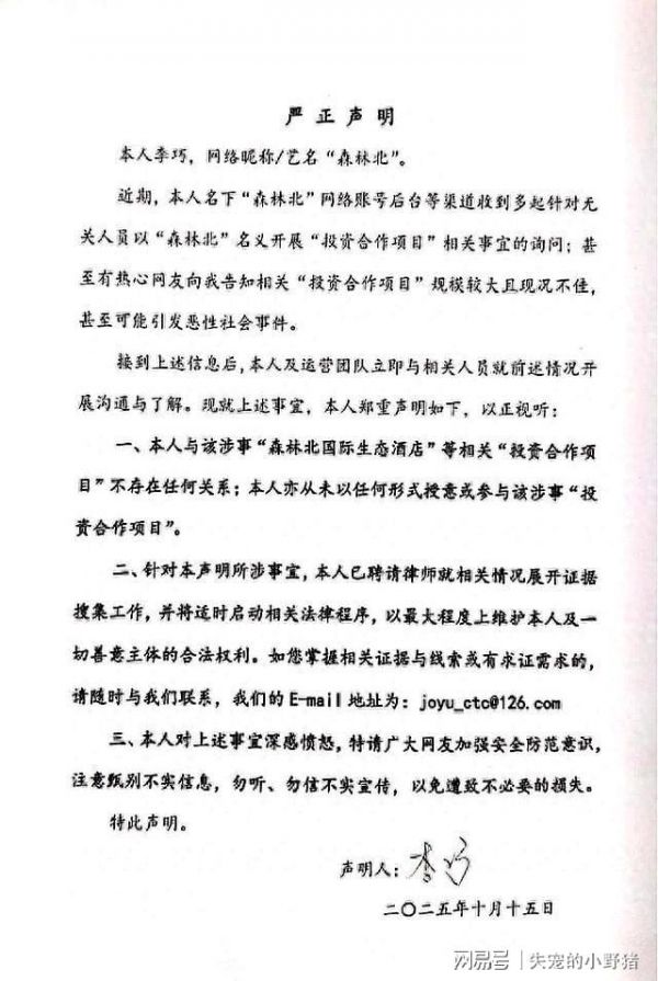 汪峰女友森林北发布严正声明,辟谣“森林北国际生态酒店”等投资项目
