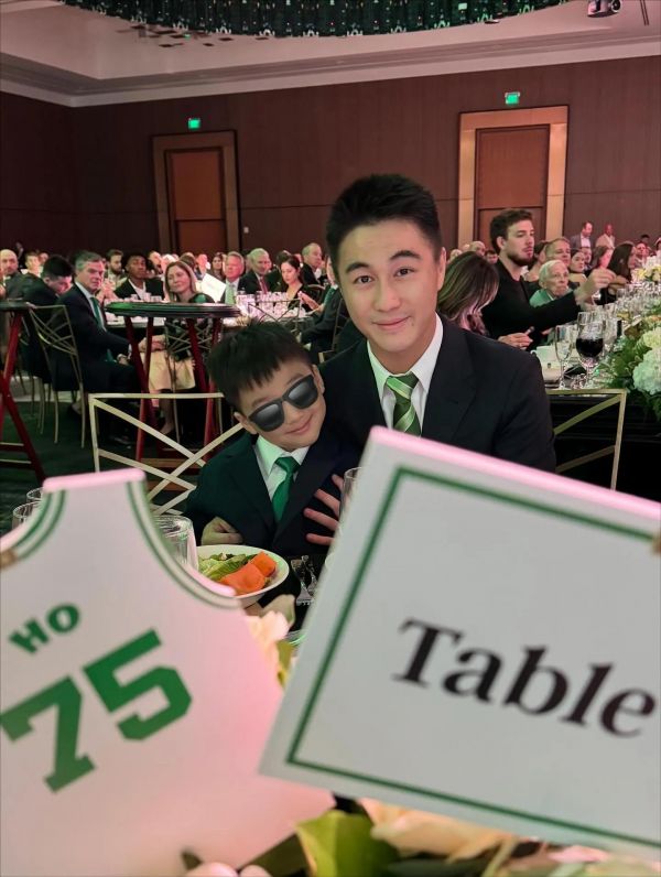 近日,何猷君带着老婆奚梦瑶和5岁的儿子何广燊一同参加了三叶草基金会慈善晚宴,一家三口还和凯尔特人球员西蒙斯拍了合影。