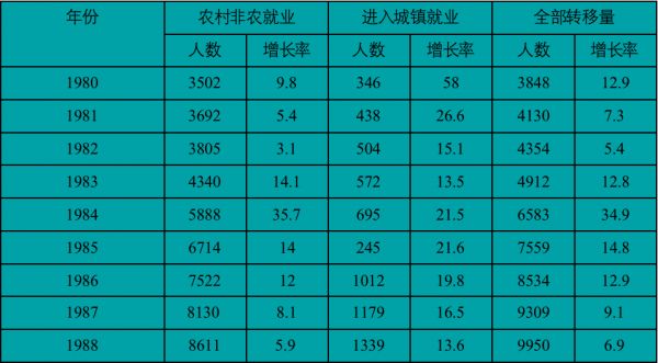 表一 八十年代年农村剩余劳动力转移状况(人数:万;增长率:%)