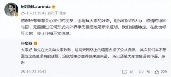 何超莲转发了窦骁的动态,她直言感谢所有善意以及关心她和窦骁的朋友,她也十分理解大家的好奇。但她和窦骁一致认为感情的稳固与否,不需要通过任何形式向外界传达,以及展示。何超莲也给大家吃了一颗“定心丸”,她直言和窦骁的感情稳定,并再次呼吁外界不要传播不实信息,人家小两口的感情好着呢。