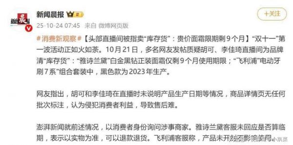 据10月24日报道,一场由胡可和李佳琦联手打造的直播带货,在售后环节彻底“翻了车”。多名网友发帖质疑,这两位头部主播的直播间,俨然成了品牌清理“库存货”的隐秘通道,一时间“信任危机”冲上热搜。