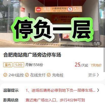 合肥南站附近停车场有很多,就像在南广场的地下就有一个带有充电桩的停车场,在这里停车的话收费会比在高铁站内部停车收费会便宜一半,这个地下停车场是按天计费,一天是25元,因为有充电桩,所以电车也可以在这里停车。像是“停小帮”等平台上就可以看到这个停车场的位置,选择好时间段之后就可以直接进去停车了。