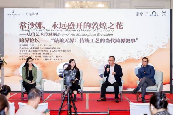 下午四点,四位受邀嘉宾在北京丽思卡尔顿酒店宴会厅,开启 “珐琅无界——传统工艺的当代跨界叙事” 主题论坛。展览出品人杨絮子作为论坛主持人:邀请常沙娜工作室北京总部总经理,敦煌常沙娜艺术中心主任曾薇瑄女士首先就常沙娜先生的艺术人生和敦煌文化以及常先生对珐琅艺术的热爱进行了分享; 随后展览总策划,北京荣会文化董事长宋宁颉先生则讲述了常沙娜先生展览作品的工艺与审美及珐琅的独特价值;X美术馆馆长尤洋先生讲述了美术馆作为美学传播机构,在敦煌文化美学的传承与创新方面的思考以及非遗商业跨界的价值分享。