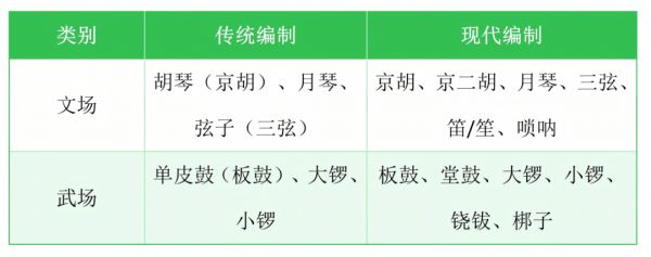 传统京剧的伴奏乐队文场与武场构成。文场主要由管弦乐组成,其核心乐器为京胡、京二胡和月琴。武场主要由打击乐组成,其核心乐器为单皮鼓(板鼓)、大锣、铙钹。(图片源于网络)