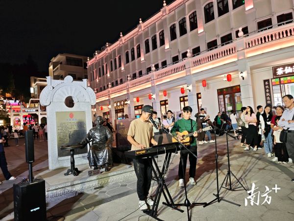 当晚,张女士带着孩子从横栏镇来到孙文西路步行街游玩,路过“香山七点半”演出现场时,忍不住停下脚步。“我在中山生活好几年了,感觉这些年文化活动越来越丰富了。今天的音乐演出也很好,可以在逛街的时候享受音乐。”她说。