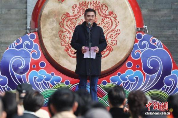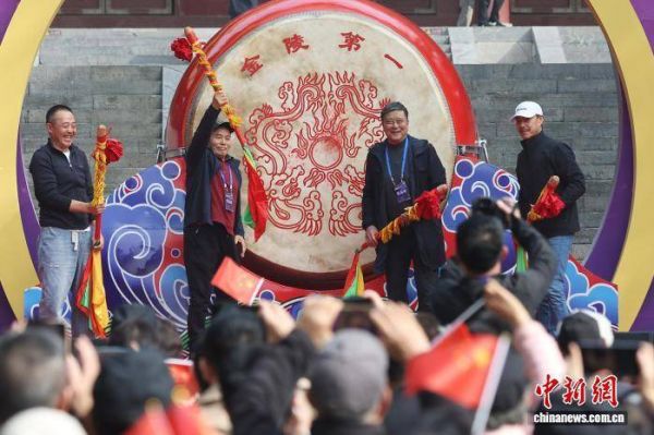 图为张丰毅(右一)等敲响大鼓。中新社记者 泱波 摄