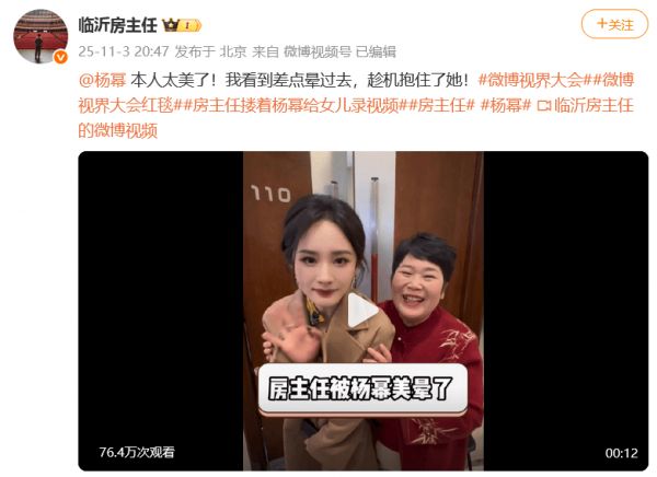 另据新黄河消息,当晚,房主任晒出在该活动后台与杨幂的互动,两人挽着胳膊聊家常,十分有爱。视频中,杨幂问房主任:“下次啥时候说(脱口秀)呀?我有机会想去现场看呢。”还拿起其演出的伴手礼,对着镜头喊:“房主任真棒!”