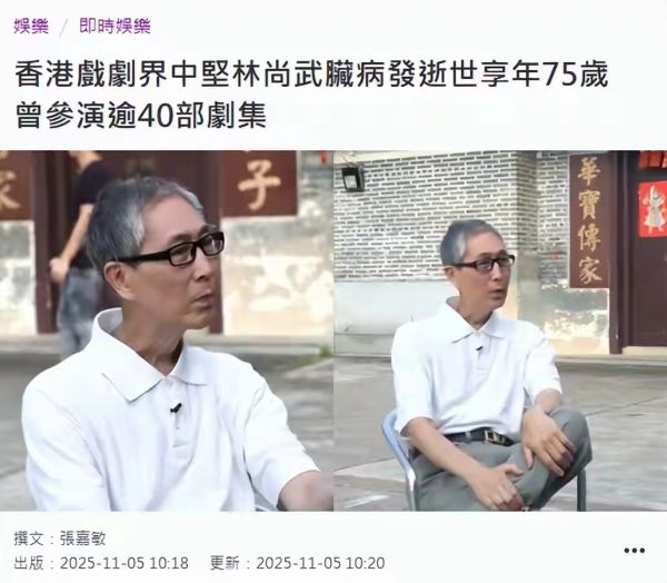 11月5日,据港媒报道,香港资深演员林尚武于昨日因心脏病发去世,享年75岁。林尚武是香港资深艺人,1978年加入香港话剧院,1989年成为TVB演员,生前共计出演了40部影视剧。曾扮演1994版《射雕英雄传》的丘处机,其他代表作还包括《壹号皇庭》《夕阳天使》《天长地久》等。