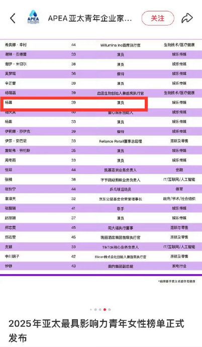 杨幂凭《生万物》入选2025亚太最具影响力青年女性
