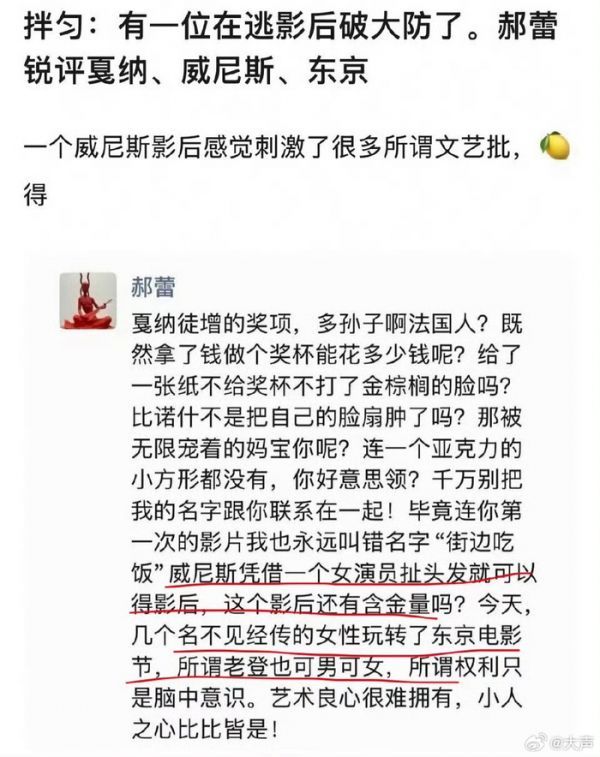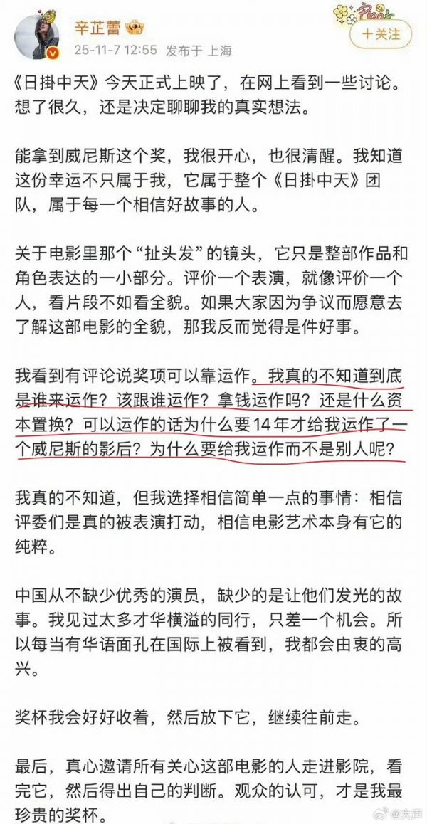 #辛芷蕾[超话]# 【署名“郝蕾”的朋友圈截图质疑有女演员靠扯头发拿到威尼斯影后#辛芷蕾回应靠扯头发得影后#】#辛芷蕾硬刚#11月7日,一张网传为郝蕾朋友圈的截图,再度引爆“奖项运作”传闻。图中,署名为“郝蕾”的微信用户在朋友圈发出以下文字,“威尼斯凭借一个女演员扯头发就可以得影后,这个影后还有含金量吗?今天,几个名不见经传的女性玩转了东京电影节,所谓老登也可男可女……”威尼斯、女演员、扯头发、影后,这些关键词,让人不由得想到9月7日凭借电影《日掛中天》拿到威尼斯影后的女演员辛芷蕾。刚刚,辛芷蕾发长文硬刚,表示要借《日掛中天》正式上映了聊聊真实想法。她说,关于电影里那个“扯头发”的镜头,“它只是整部作品和角色表达的一小部分。评价一个表演,就像评价一个人,看片段不如看全貌。如果大家因为争议而愿意去了解这部电影的全貌,那我反而觉得是件好事。”她回应奖项运作甚至“德不配位”的疑问:"我看到有评论说奖项可以靠运作。我真的不知道到底是谁来运作?该跟谁运作?拿钱运作吗?还是什么资本置换?可以运作的话为什么要14年才给我运作了一个威尼斯的影后?为什么要给我运作而不是别人呢?"辛芷蕾补充:“我真的不知道,但我选择相信简单一点的事情:相信评委们是真的被表演打动,相信电影艺术本身有它的纯粹。”她还意有所指回应署名郝蕾的这则朋友圈:“中国从不缺少优秀的演员,缺少的是让他们发光的故事。我见过太多才华横溢的同行,只差一个机会。所以每当有华语面孔在国际上被看到,我都会由衷的高兴。”#辛芷蕾发长文谈日掛中天#