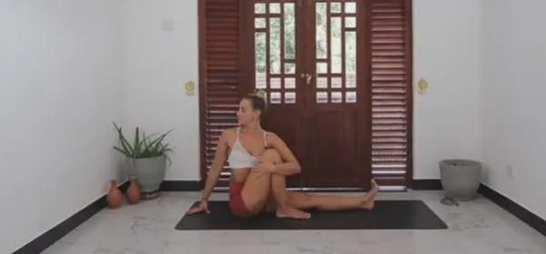 练习步骤:直角式坐姿坐立在垫子上,脚趾回勾,脚跟登出。屈右膝向上,将右脚拉向会阴处,放在左大腿的内侧。呼气,抬右臂,眼随手动,肚脐带领身体向右后方扭转,将右手放在臀部的后方,左手环保右膝,眼睛看向右肩延长线,在这个体式上保持20秒钟,吸气,头部回到正中。呼气,换侧同样练习。