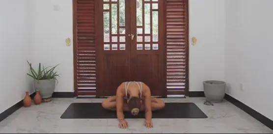 侧角伸展式完成之后,呼气,落下右臂,回正身体,撤右脚向后,推臀向后来到婴儿式调息,然后换侧练习。