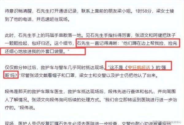 也就是在这个时候,被撞的这个人手腕上的玛瑙手串断了,珠子散落一地,张颂文和朋友非常细心的一颗一颗把珠子捡了起来放进被撞者的口袋里,