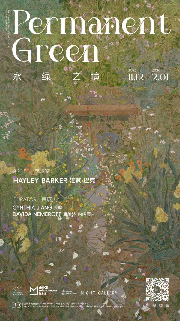 11月12日至2026年2月1日在上海K11呈现由姜晔及黛维达·内梅罗夫联合策展的“永绿之境 Permanent Green”,该展览是美国艺术家海莉·巴克(Hayley Barker)在中国举办的第二次个展,展览呈现艺术家的十一幅新作。展览标题特指一种颜料名,以此回应海莉·巴克为这批新作调制出的无数种绿色——从深至浅,从柔和到浓郁,并最终彻底沉醉于绿色之中的她。海莉·巴克的实践核心在于其坚信自然即神圣本源,她的精神与大地连结,摒弃了将自然视为遥远荒野的观念,转而从日常景致中发现神圣意味,在其平等主义世界观中,路旁灌木与著名景观具有同等价值,教我们重新审视与珍视身边的环境与自然。海莉·巴克承袭查尔斯·伯奇菲尔德、克里姆特及纳比派等风景画大师脉络,并重新诠释属于她的灵性世界与自然中搏动的生命力。“永绿之境”是一场关于沉思与冥想的极致呈现,致敬那些使我们人生完整的所爱之人与联结并滋养众生的土地。