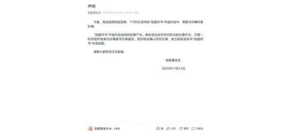 声明表示:“韬奋好书”中选作品由网民投票产生。我会坚决反对任何形式的抄袭行为,已第一时间组织专家对涉事图书开展鉴定。若经核实确认存在抄袭,将立即取消该书“韬奋好书”中选资格。感谢大家的关注与监督。