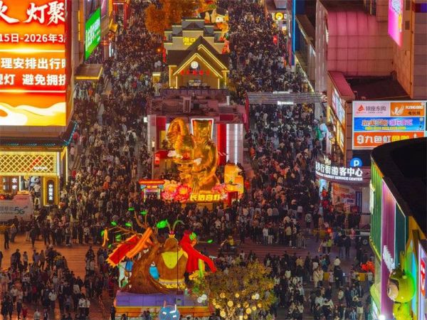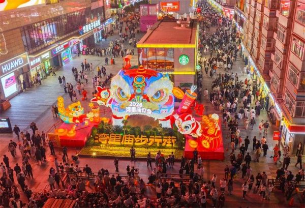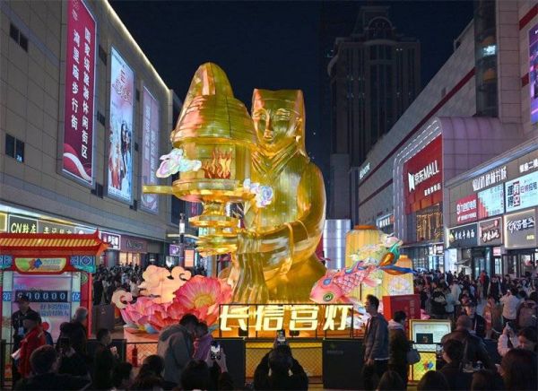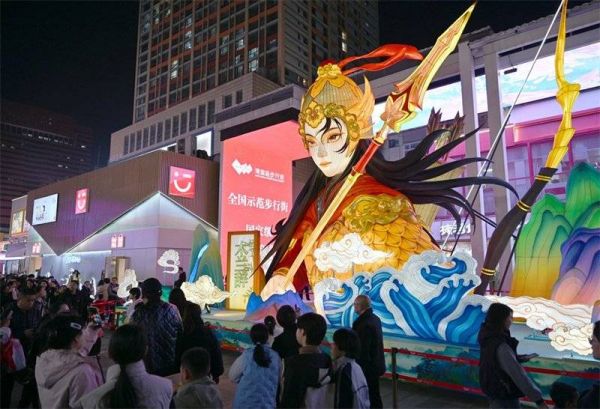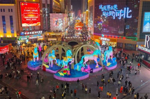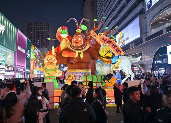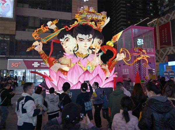 11月15日,市民在石家庄市湾里庙步行街参观灯会。