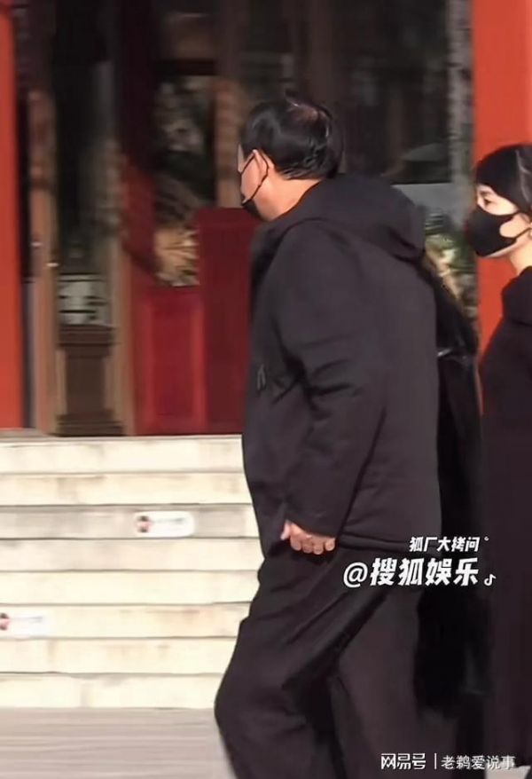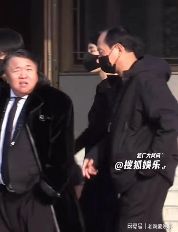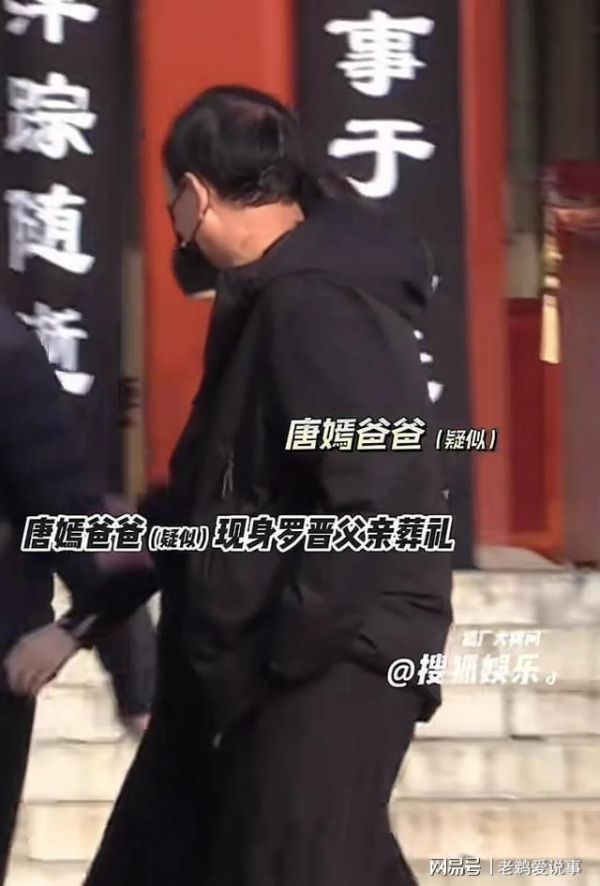 唐嫣父亲穿着黑色羽绒服,戴着黑色口罩,神情悲伤,行色匆匆,急着赶到罗晋父亲的告别式现场。