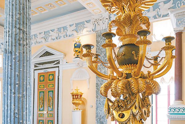 埃及馆建于1795年,是个多功能场所:既可用作正式宴会厅,也可用作音乐会与戏剧表演大厅。馆内装饰由保罗一世的宫廷建筑师文森佐·布伦纳设计,他还是米哈伊洛夫宫和巴甫洛夫斯克宫内饰的设计者。此次修复工作依据18世纪末的宫廷记录清单与档案文献进行。