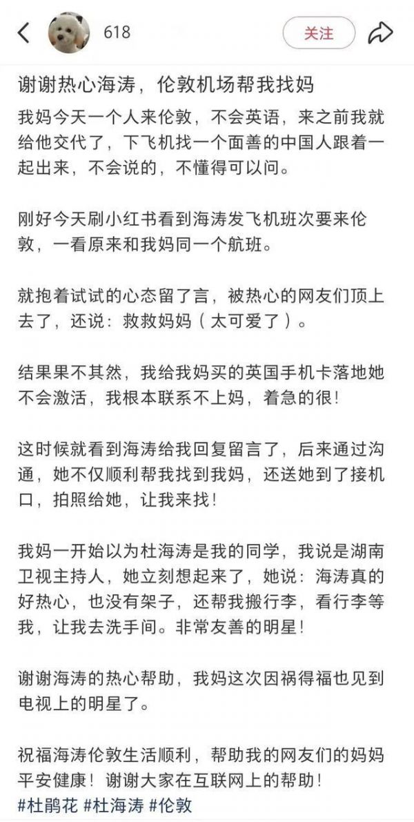 近日,一名在英国的网友发帖分享暖心经历,称赞主持人杜海涛在航班上热心助人。