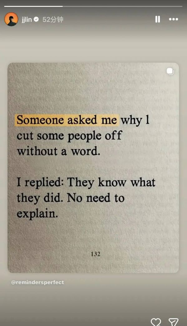 近日,有网友于洛杉矶偶遇44岁的林俊杰与一名女生同行,网传该女生是23岁网红“七七”,相关消息随即引发网友热议。25日,林俊杰更新快拍,配图上写着:“有人问我为何悄无声息地与某些人断绝来往。我答道:他们心知肚明,无需多言。” 随后又在评论补充:“耐心… ”许多网友猜测林俊杰疑似回应恋情。