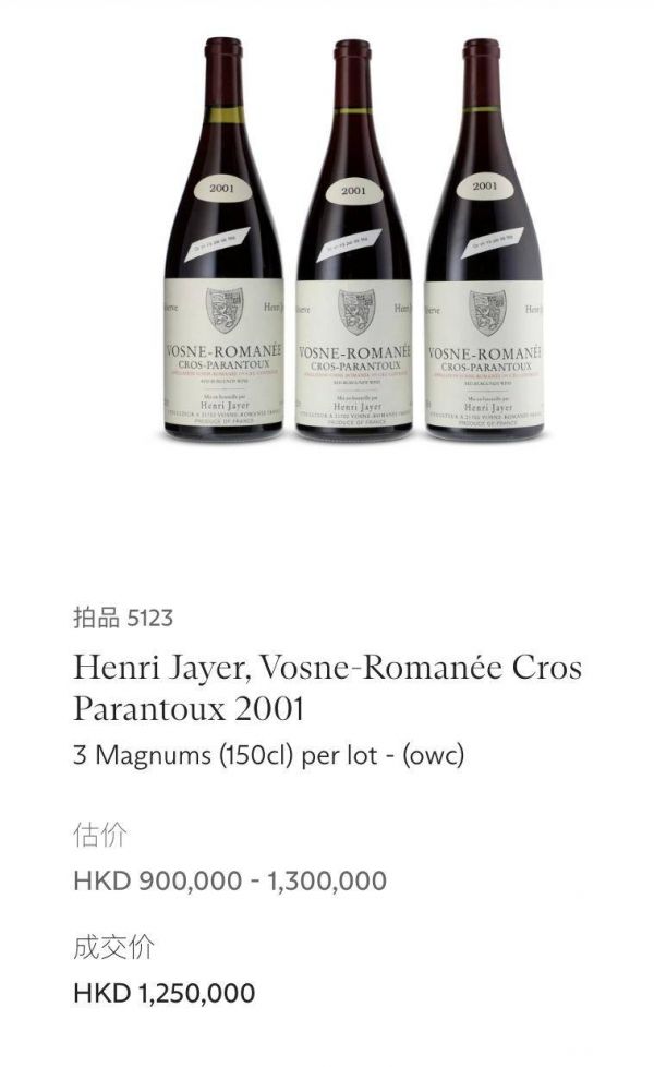 刘銮雄第四度携手佳士得举办佳酿拍卖会,此次他拿出了155件佳酿,估值约2800万。就佳酿的件数以及估值,第四部分不如第三部分,不过依然有不少珍品佳酿被展示。据佳士得公开的信息了解,此次被拍卖的佳酿中最珍贵的依然是Henri Jayer,这是刘銮雄购自2012年《佳士得名酿:Henri Jayer私人窖藏》的佳酿,其中估价最高的是六瓶750ml的Henri Jayer,Vosne-Romanee Cros Parantoux 2001以及三瓶装的1.5L的同款2001年份的Henri Jayer,估价在90万至130万之间。
