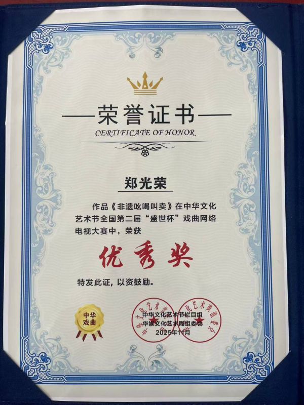 在专业赛事中,他凭借实力崭露头角:在中华文化艺术节全国第二届“盛世杯”戏曲网络电视大赛中,作品《非遗吆喝叫卖》荣获优秀奖;斩获当代“作家杯”文学艺术大赛一等奖;在2025第七届歌友网颂歌献祖国第9季活动中,荣获**“魅力风采奖”**。这些荣誉,是业界对其艺术水准与作品价值的高度认可,也让“非遗吆喝叫卖”在专业艺术领域占据了一席之地。