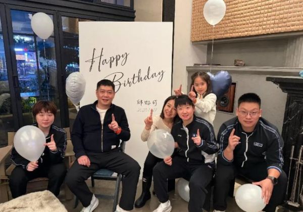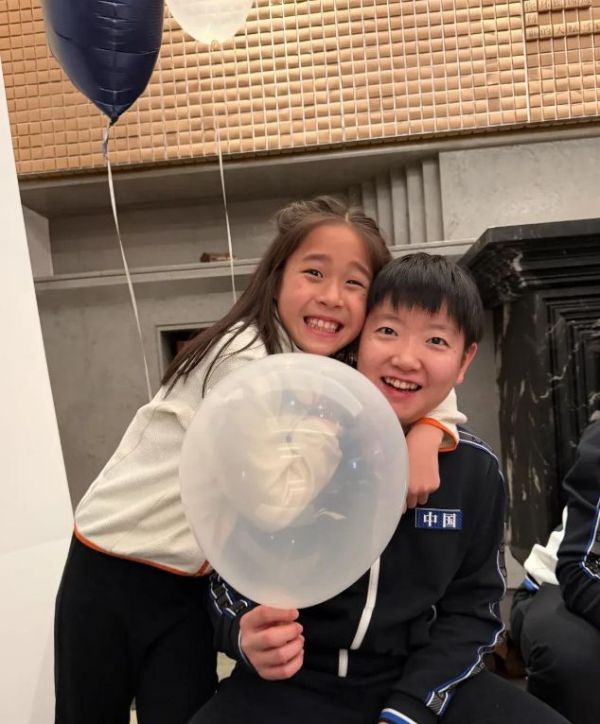 邱贻可庆生获妻女及孙颖莎蒯曼祝福,小豌豆搂莎莎合影表情夸张