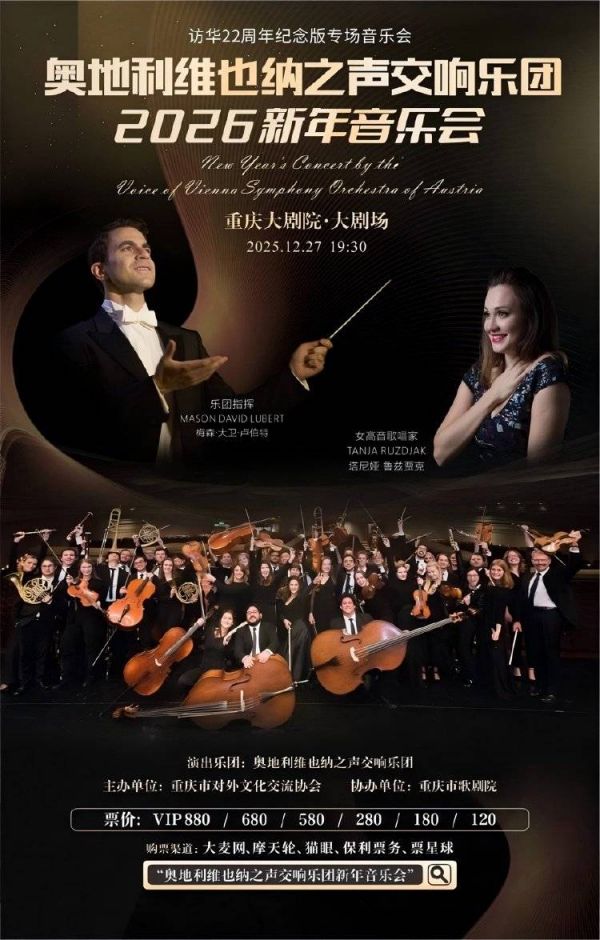 当多瑙河的旋律邂逅两江交汇的涛声,一场世界级的音乐盛宴即将点亮重庆的冬日夜空。由重庆市对外文化交流协会主办的《奥地利维也纳之声交响乐团2026新年音乐会》,将于12月27日在重庆大剧院大剧场上演。本场音乐会现已正式开票,市民可通过大麦网、摩天轮、猫眼、保利票务、票星球等平台购票,共赴这场跨年音乐之约。