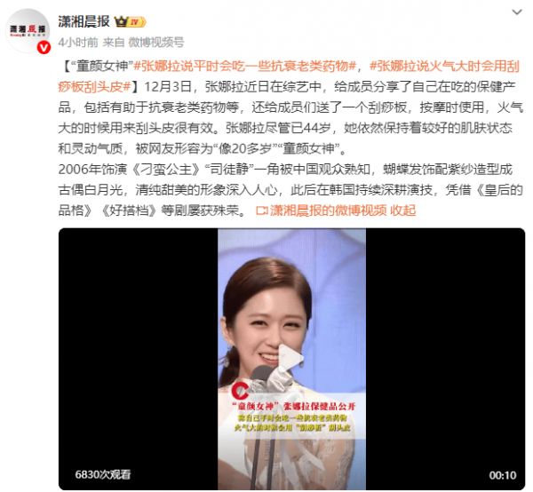 “童颜女神张娜拉自曝吃抗衰药 还会刮痧刮头皮