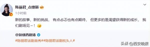 陈丽君回应:新的故事,新的挑战, 有点忐忑也有点期待, 但更多的是渴望获得新的成长, 我们剧场见~!